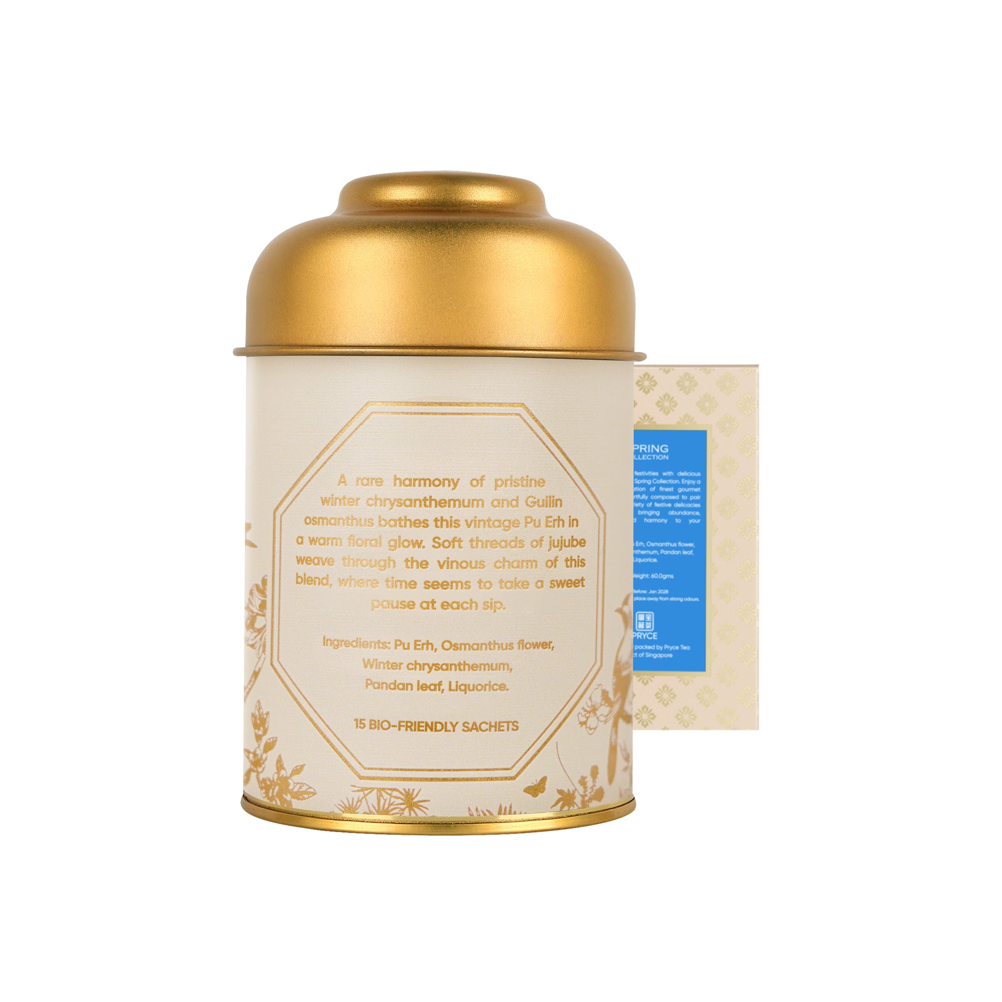 Quiet and sophisticated, this Winter Chrysanthemum Pu Erh tea is like a saunter through Mongolia’s vast flower fields. A rare harmony of pristine winter chrysanthemum and Guilin osmanthus bathes this vintage Pu Erh in a warm floral glow. Soft threads of jujube weave through the vinous charm of this blend, where time seems to take a sweet pause at each sip.